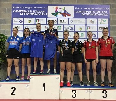 Si sono appena conclusi i Campionati Italiani di Categoria 2^ 3^ 4^ 5^ 6^ svoltisi a Riccione dal 25/05 al 08/06/2019 a cui ns. atleti hanno partecipato i in ognuna delle Categorie. L’ASD Marino Allestimenti Asola ha portato a casa una Medaglia d’Oro ed una di Bronzo grazie all’ottima prova delle ns. atlete di punta Visentin Chiara e Mescieri Sofia. La diciassettenne Visentin Chiara, in coppia con Frisone Stella (ASD TT Savona), ha conquistato il titolo di Campionessa Italiana di doppio femminile 3^ Categoria: nel primo incontro del tabellone finale hanno eliminato in successione la coppia Nocchi Valentina (TT Livorno)/Zucchetti Giulia (TT Verzuolo) per 3/1, Criscione Nicoletta (TT Vittoria)/Salliu Emli (TT Castel Goffredo) sempre per 3/1, Cerritelli Margherita (TT Vasto)/De Costanzo Anastasia (TT Torino) per 3/1, in semifinale la coppia Thai Kim Lan Elena (Castel Goffredo)/Cicuttini Eleonora (Castel Goffredo) per 3/0 ed in finale Ros Valentina (TT San Giorgio)/Lorenzin Cristina (TT Lavis)sempre per 3/0. L’asolana Mescieri Sofia in coppia con la compagna di squadra Visentin Chiara ha conquistato un onorevolissimo terzo posto nel doppio femminile di 2^ Categoria. Nel tabellone finale ad eliminatoria diretta, dopo aver sconfitto nell’ordine la coppia Bracco Bianca (TT Alfieri di Romagna)/Carli Eva (C.S. Sportni Krozek Kras) e Nino Martina (TT Torino)/Roncallo Valentina (TT Toirano) con un sofferto 3/2, sono state fermate in semifinale dalla coppia Angeli Caterina (TT Castel Goffredo)/Arlia Nicole (TT Castel Goffredo) per 3/1. Meno fortunata la prova nei doppi misti: Visentin Chiara si è classificata nei primi otto in coppia con Pellizzon Shasa (ASD Pol.Treviso) nel doppio misto 3^ Categoria. Nel doppio misto 2^ Categoria, Mescieri Sofia in coppia con Ragazzo Pierangelo (ASD Pol.Treviso) si è fermata nei primi sedici mentre Visentin Chiara, in coppia con Moro Giacomo (TT Vicenza) nei primi trentadue. Nel singolo 2^ Categoria, forse per un calo fisico e di concentrazione dopo tanti incontri, sia Visentin che Mescieri non hanno superato il girone eliminatorio. La 4^ Categoria maschile (con oltre 440 atleti) ha visto la partecipazione dei ns. giovani Storti Nicola e Gaboardi Manuel: il solo Storti è riuscito a superare il girone ma è stato sconfitto al primo turno del tabellone finale. Nella 5^ Categoria femminile molto buona la prova della giovanissima Etur Martina che sia nel singolo che nel doppio femminile è entrata nelle prime otto posizioni. Nella 6^ Categoria maschile, il ns. veterano Cappellini Attilio (Classe 1940) in coppia con Palazzoli Gianfranco (Classe 1934) dopo aver superato il primo turno si è fermato al successivo nel doppio, mentre nel singolo, ha terminato con cinque punti il girone ma classificandosi al terzo posto per la classifica avulsa. Al termine delle gare, la Marino Allestimenti Asola si è attestata al 31° posto nella classifica per Società su ben 198 iscritte ai Campionati. Dopo 15 giorni intensi di gare, la maratona dei Campionati Italiani di Categoria conclude praticamente la Stagione agonistica 2018/2019 ed il bilancio per la ns. Società è largamente positivo; il Presidente Donato Radice ha espresso la soddisfazione sua e del direttivo per il comportamento sia dei giovani atleti e che degli “anziani” ottimamente coordinati dallo staff tecnico Capra/Girbina ai quali vanno rinnovati i ringraziamenti per l’impegno profuso durante tutto l’anno.